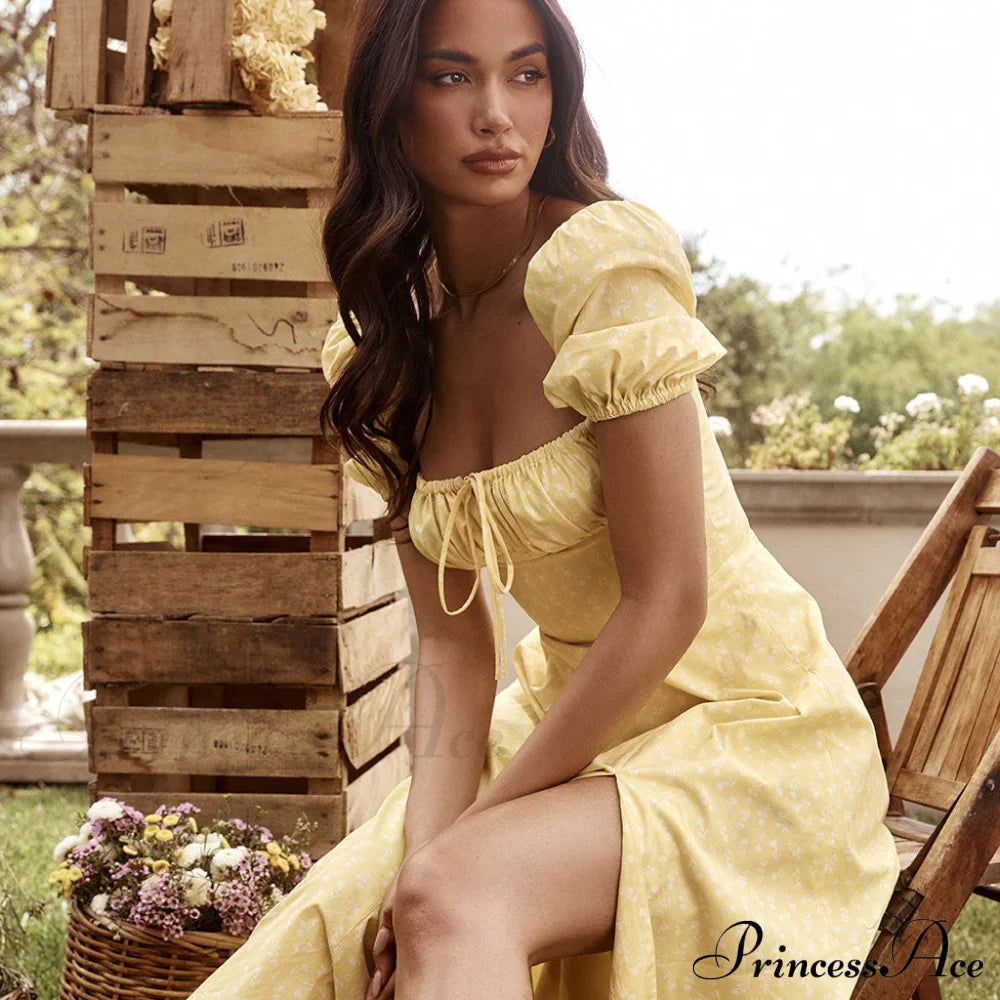 Go ahead and get a little risky with this cute and sexy printed sun dress. Made from cotton blend fabric and polyester. stand out in flower patterns throughout. featuring a square neckline structured with a ruched trim drawstring tie and a keyhole at the chest. a fit-and-flare cut tailored with covered elastic puffy sleeves. a rear zip fastening. and the particularly long length accented with a dramatic side slit. Find more unique women's summer dresses or trendy clothing in our boutique. and complete a sweet French style with high sandals in sunny days or toss on a jacket and heeled boots in fall and winter.