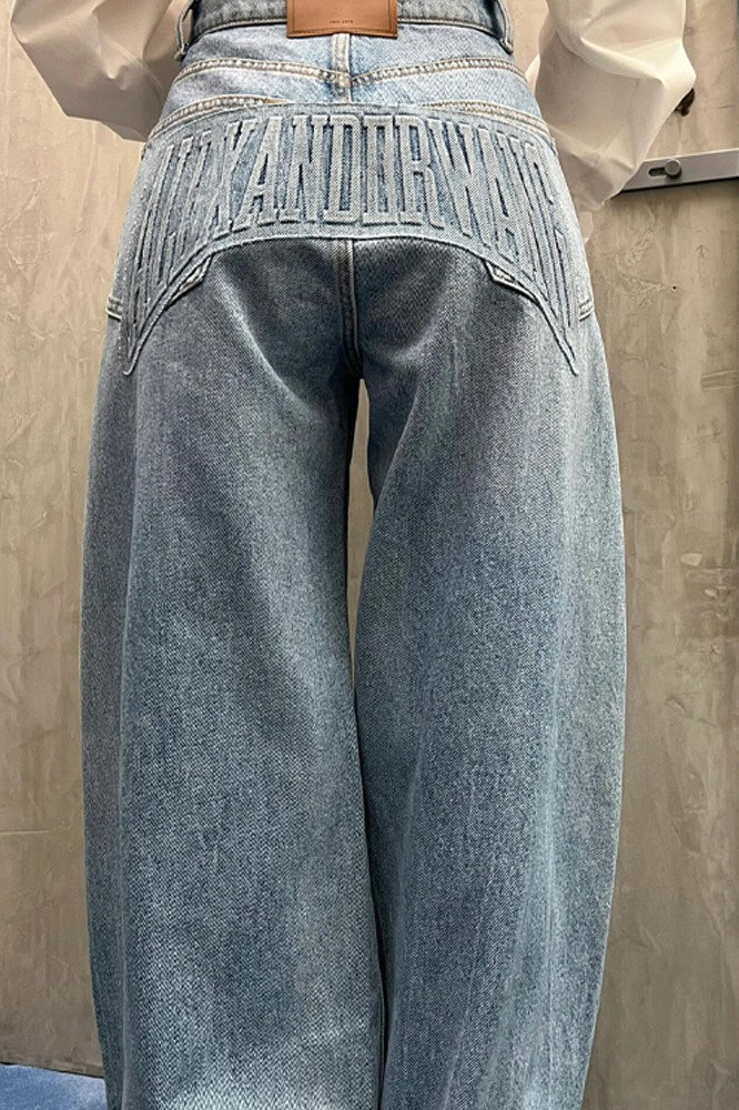 Loose Floor Length Curved Leg Washed Letter Embossed Jeans