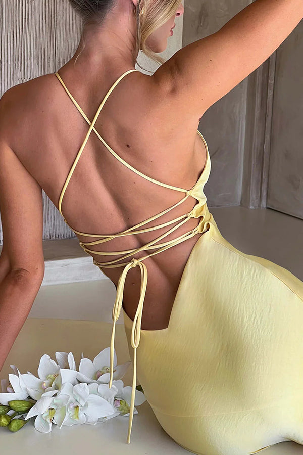 Satin Solid Color Sexy Backless Lace Up High Slit Maxi Dress