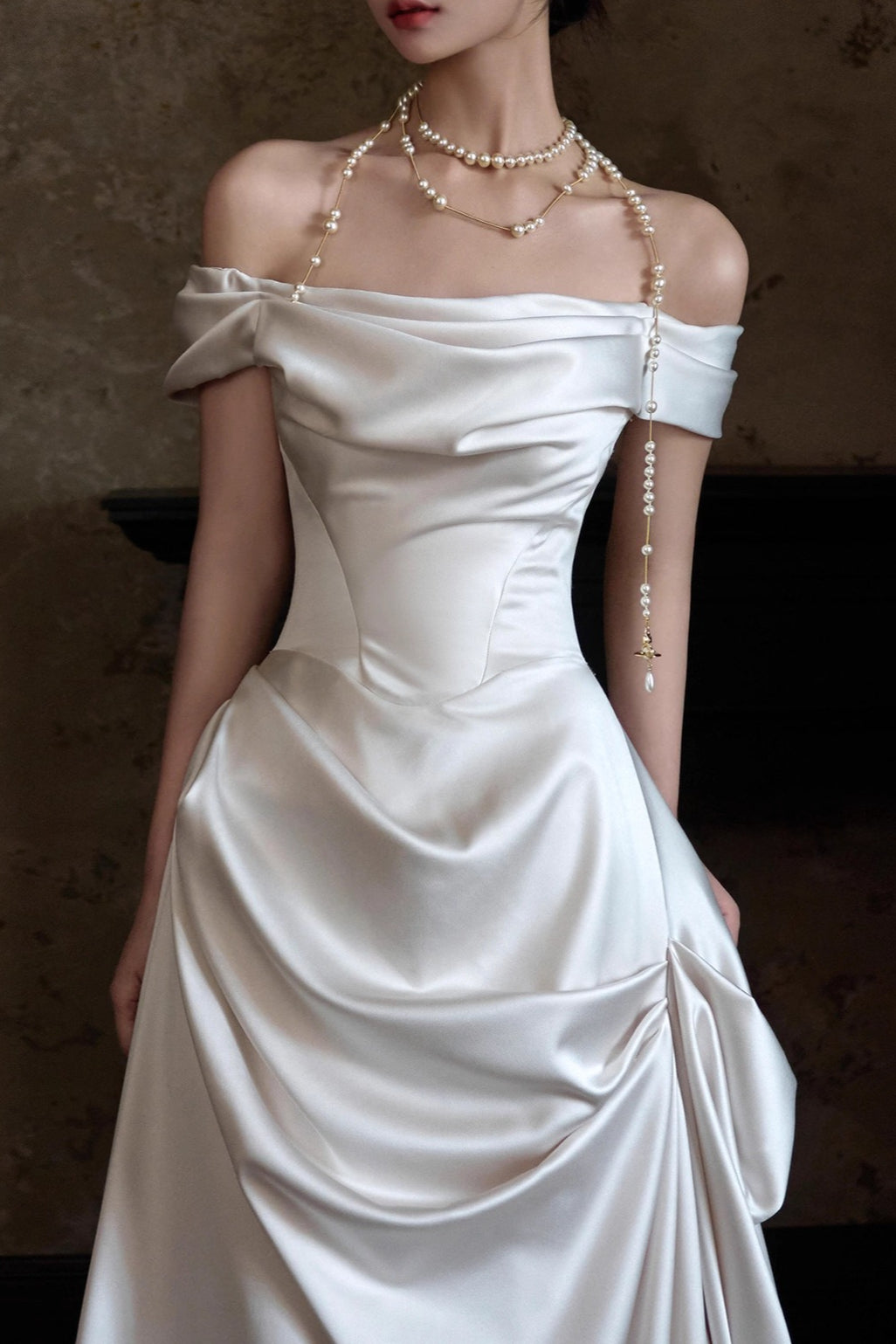 Off Shoulder Satin Train Reception Dress