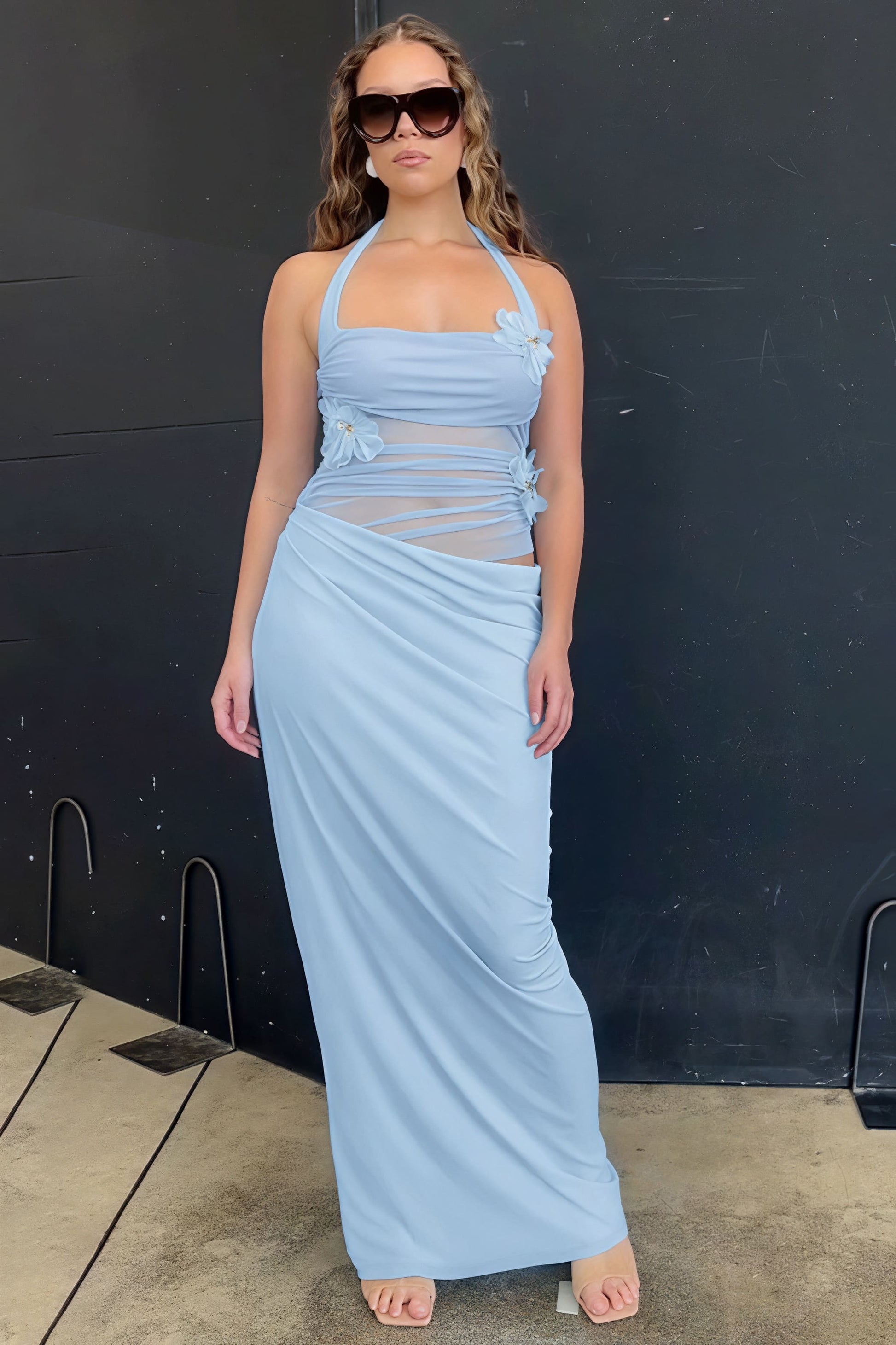 3D Floral Patchwork Halter Slim Cutout Waist Maxi Dress